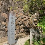 本丸跡から見える鉛筆のような形の不思議な碑。後で調べたら、謝恩碑(しゃおんひ)だということが判明。