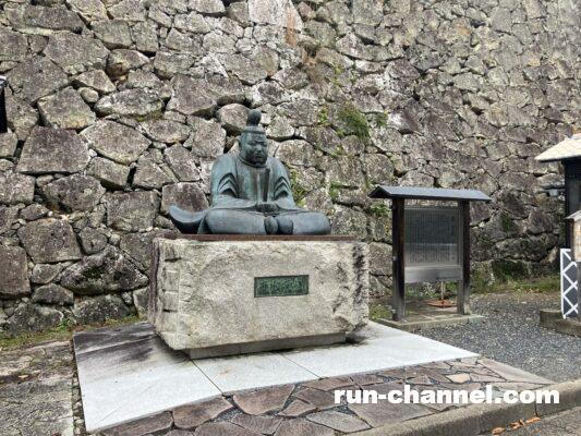 こちらが森忠政公の銅像。森蘭丸といえば、織田信長の寵愛を受けた美少年のイメージですが、弟の忠政公は銅像を見る限り・・(以下自粛)その後も、鶴山全部を使ったと言われる渦巻き型の石垣づくりで三の丸から本丸まで段々に重なった石垣がきれいに続いていきます。