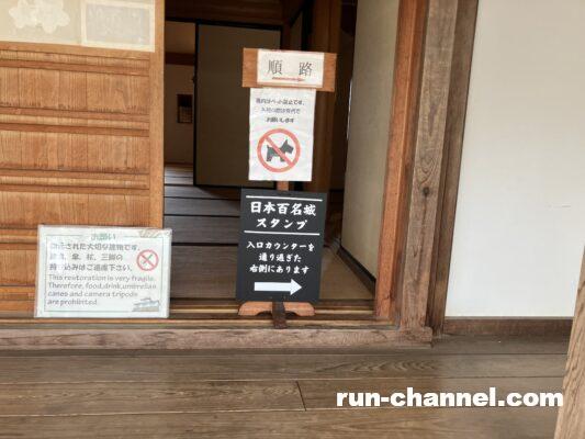 ここからは靴を脱いでお邪魔します。入口には100名城スタンプの押し場所を案内する看板♪心が高鳴ります♪