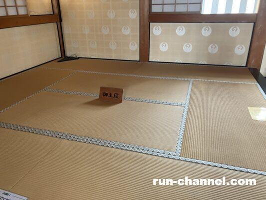 御上段と書かれたお座敷。備中櫓は、全室畳敷きの居室で、一階には床と違い棚を持つ御座の間や茶室、二階には二間四方の御上段が備わり、壁やふすまには唐紙が使用されるなど瀟洒な設えとなっていたそうです。